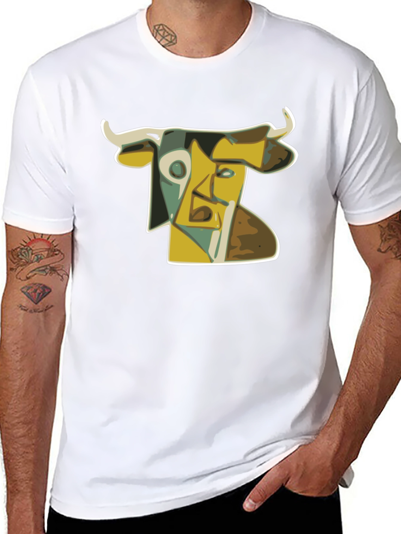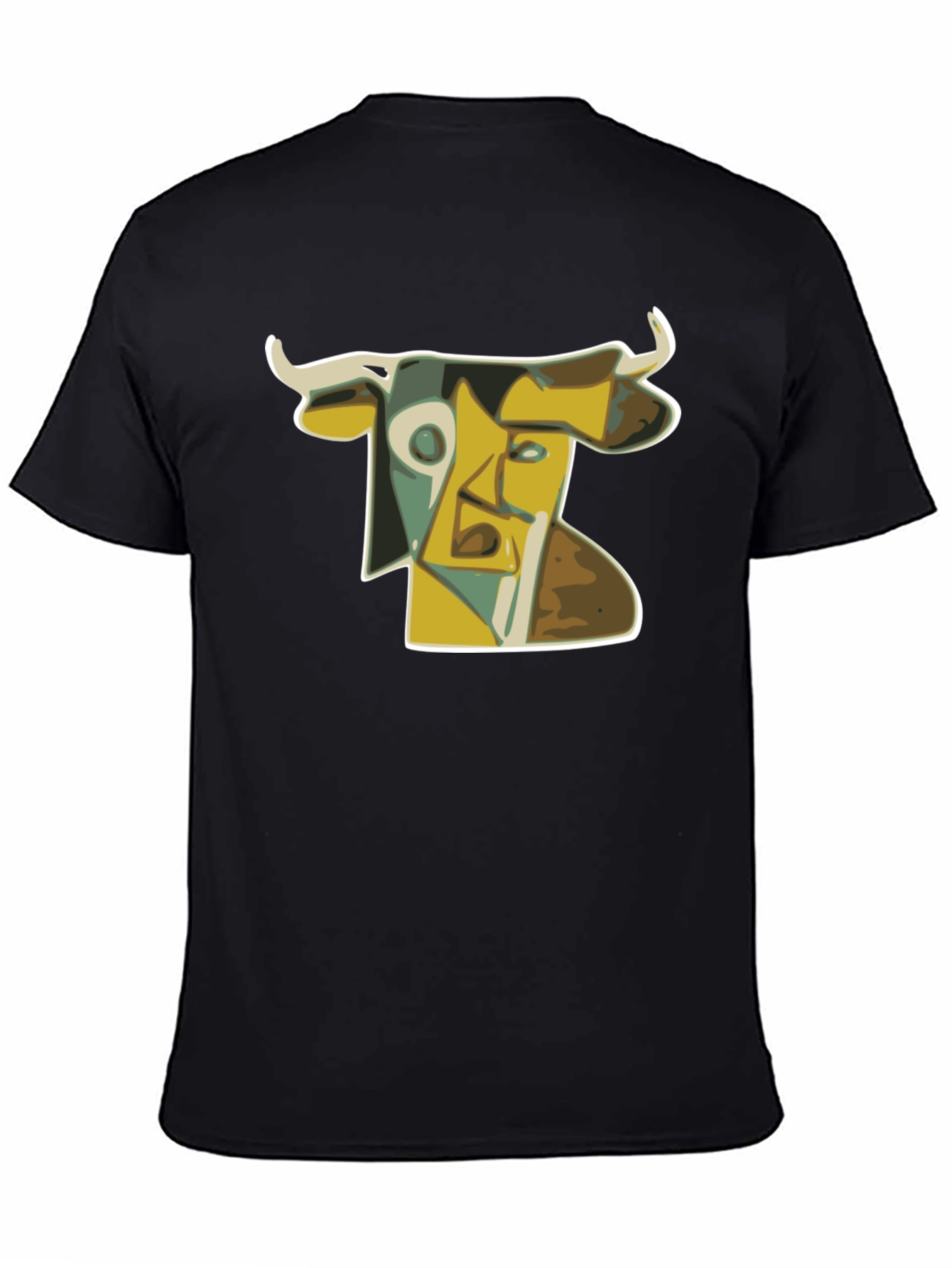 Embrace artistic expression with this unique black t-shirt featuring an abstract bull design. The eye-catching graphic showcases a modern art style with geometric shapes and a muted color palette. Crafted from comfortable material, this tee offers a relaxed fit for everyday wear. Perfect for art enthusiasts, this t-shirt adds a creative touch to any outfit. Pair it with jeans or chinos for a casual yet stylish look. Make a statement with this wearable art piece!