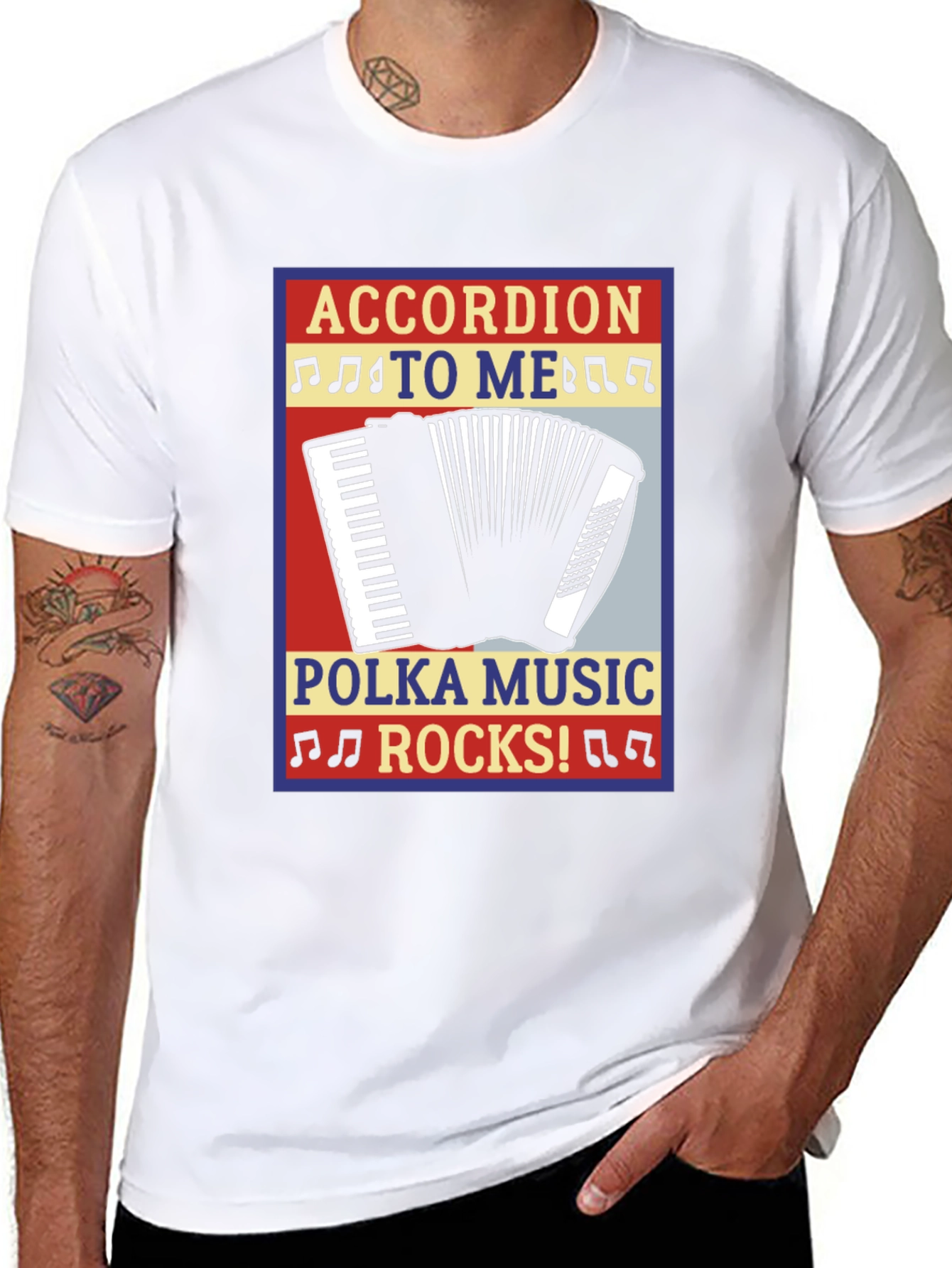 Rock out with this unique black t-shirt featuring a vibrant accordion graphic. The design proudly states "Accordion to Me Polka Music Rocks!", making it a must-have for polka enthusiasts and music lovers alike. Crafted from comfortable, breathable fabric, this tee is perfect for casual wear, music festivals, or showing off your love for this lively genre. Stand out from the crowd and let the world know that polka rocks with this eye-catching and stylish t-shirt. Great for musicians, fans, and anyone who appreciates a good time!