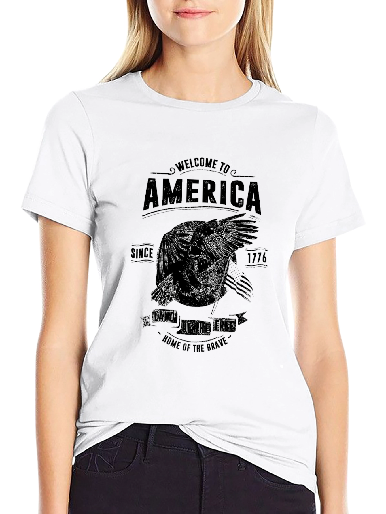 Show your American pride with this bold graphic t-shirt. The black tee features a prominent graphic design showcasing an eagle with spread wings, overlaid on an American flag backdrop. Above the eagle, the words "Welcome to America" arch in a classic font, flanked by "Since" and "1776". The text below reads "Land of the Free" and "Home of the Brave". This shirt is perfect for casual wear, showing patriotism, and celebrating American heritage. The soft, breathable fabric ensures all-day comfort. A great addition to any wardrobe!