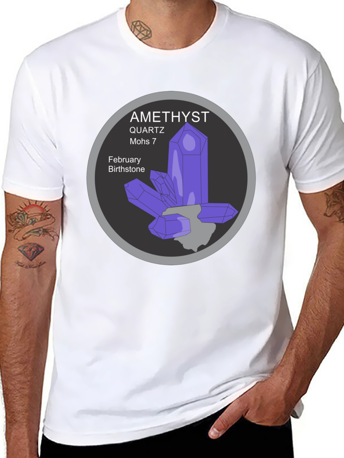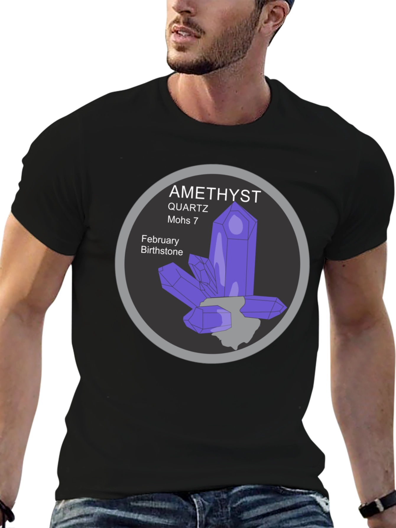 Embrace the beauty of amethyst with this stylish black t-shirt. Featuring a captivating graphic of amethyst quartz, the birthstone for February, elegantly displayed within a circle design. Ideal for crystal enthusiasts and those who appreciate unique artwork, this tee combines comfort and self-expression. Its soft fabric ensures a comfortable fit, making it perfect for everyday wear or as a thoughtful gift. Show off your birthstone with pride and add a touch of mystical charm to your wardrobe with this eye-catching t-shirt.