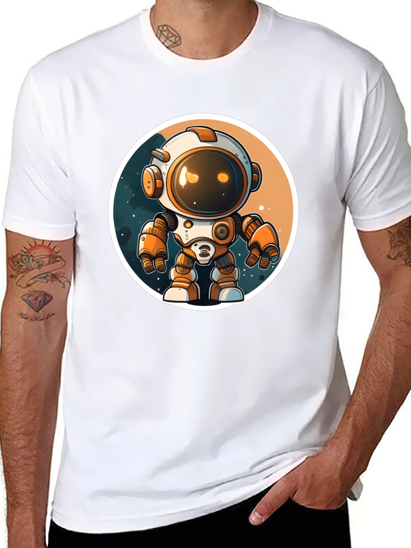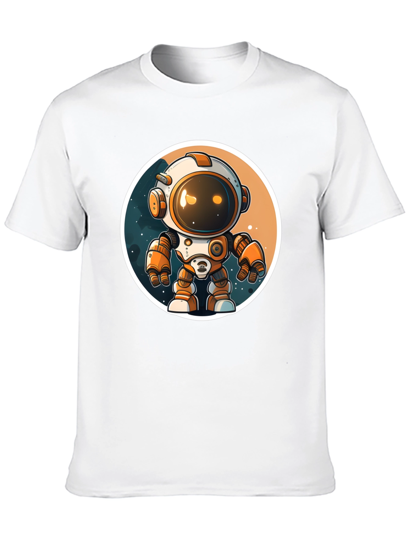 Elevate your wardrobe with this unique black t-shirt featuring a vibrant, cartoon-style graphic of an astronaut robot. The design showcases a white and orange robot with a rounded helmet, set against a backdrop suggestive of space. The shirt appears to be made of a soft, comfortable fabric perfect for everyday wear. This eye-catching tee is ideal for casual outings, expressing your personality, or making a statement. Perfect for science fiction fans, tech enthusiasts, or anyone who loves bold and playful designs. Its comfortable fit makes it suitable for various activities, from running errands to lounging at home. Stand out from the crowd with this fun and fashionable graphic tee!