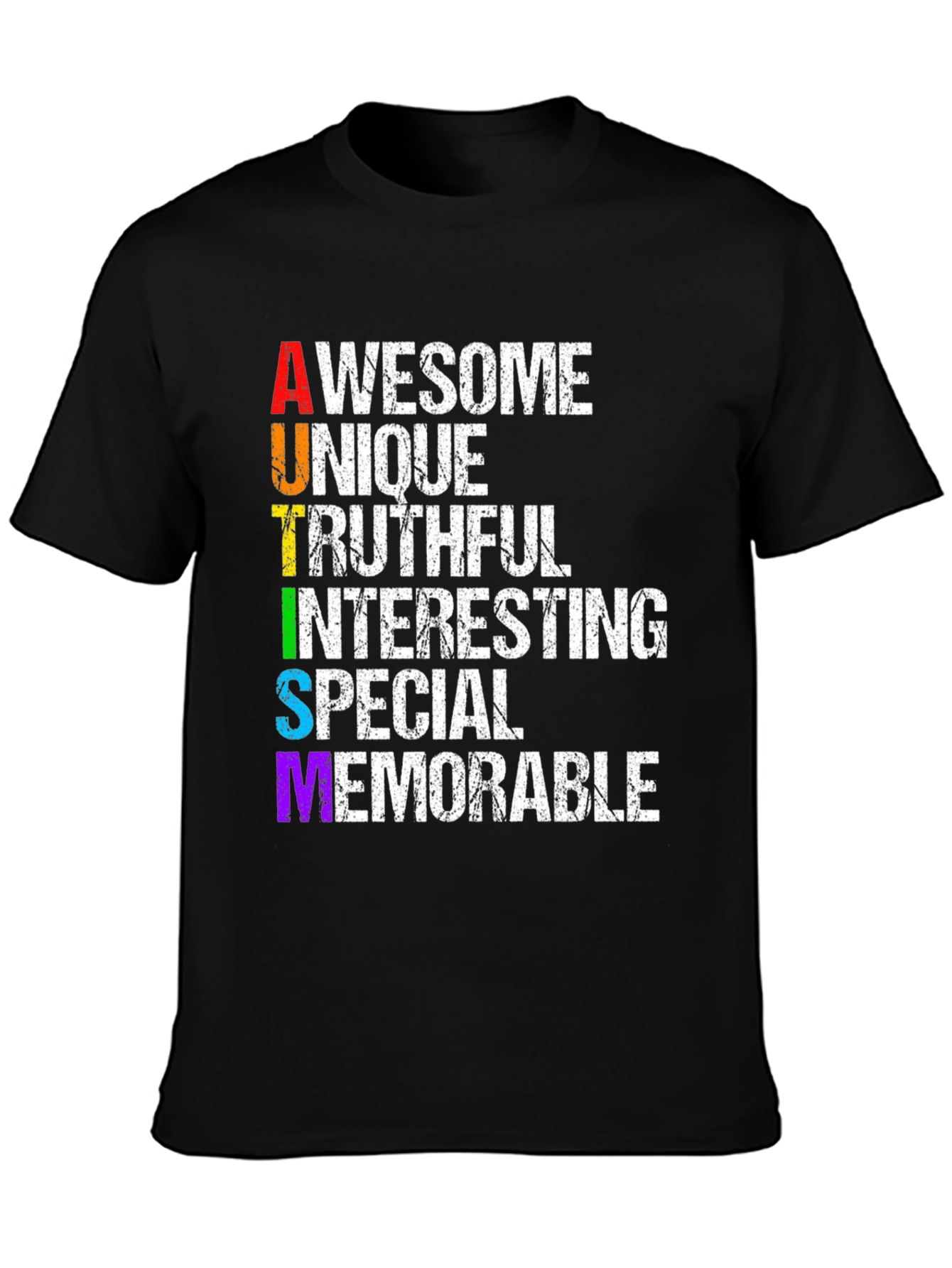 Show your support with this eye-catching black t-shirt featuring a colorful word art design representing Autism awareness. The design spells out "Autism" with each letter standing for a positive trait: Awesome, Unique, Truthful, Interesting, Special, and Memorable. Made from a comfortable, breathable fabric, this tee is perfect for everyday wear, Autism awareness events, or as a thoughtful gift for someone special. The white distressed lettering adds a touch of vintage style. Wear your heart on your sleeve and spread positivity with this meaningful and stylish t-shirt.