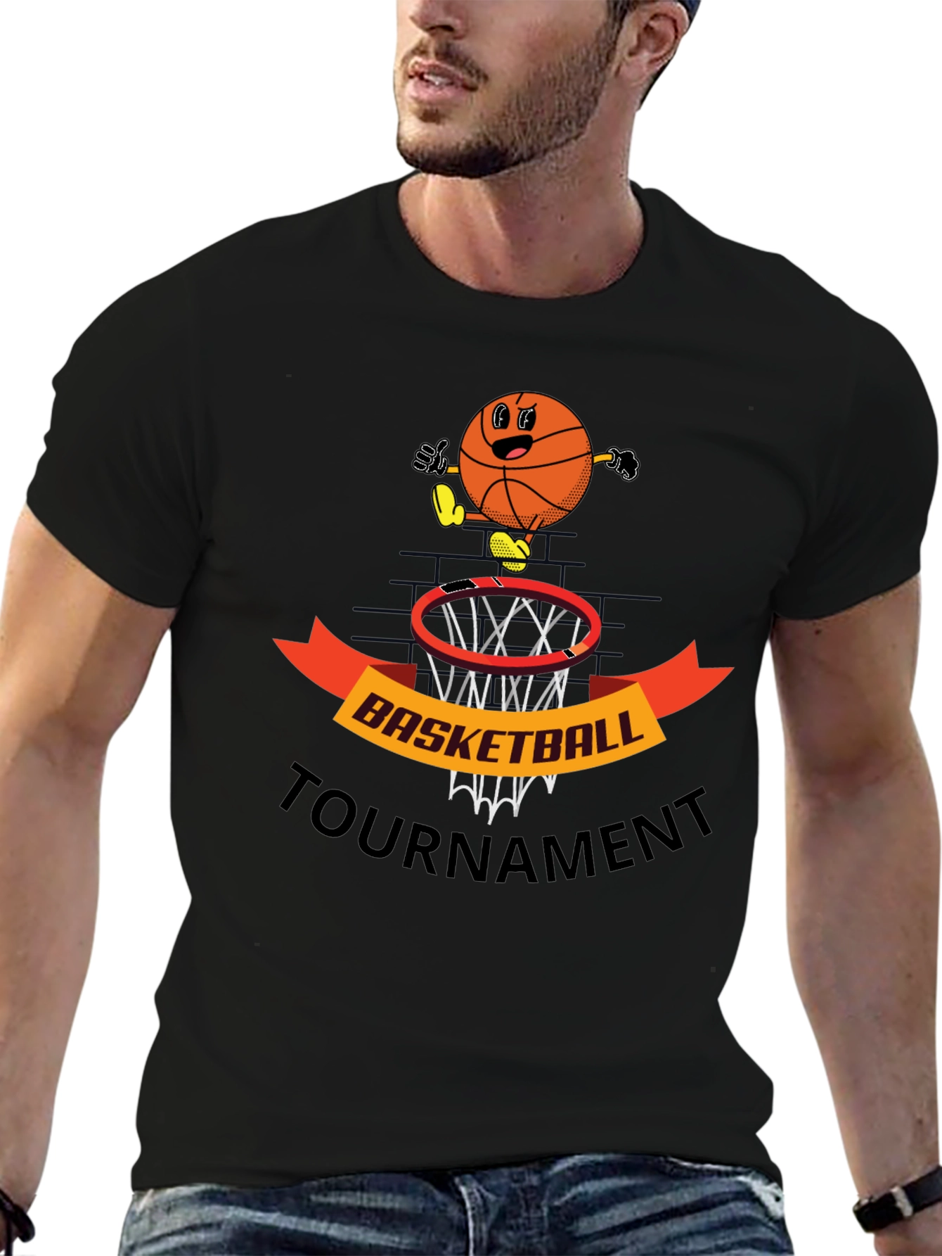 Score big with this black graphic tee! Features a playful cartoon basketball character dunking over a net, complete with a banner reading "Basketball Tournament". This soft and comfortable tee is perfect for players and fans alike. Show your love for the game on and off the court. Great for casual wear, sports events, or a fun day out. Available in a range of sizes. Grab yours today!