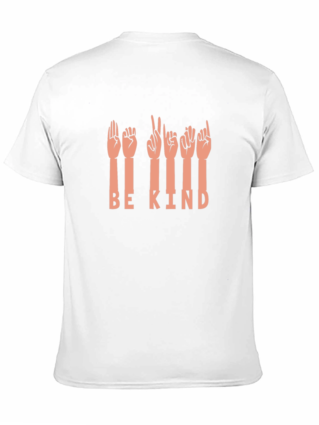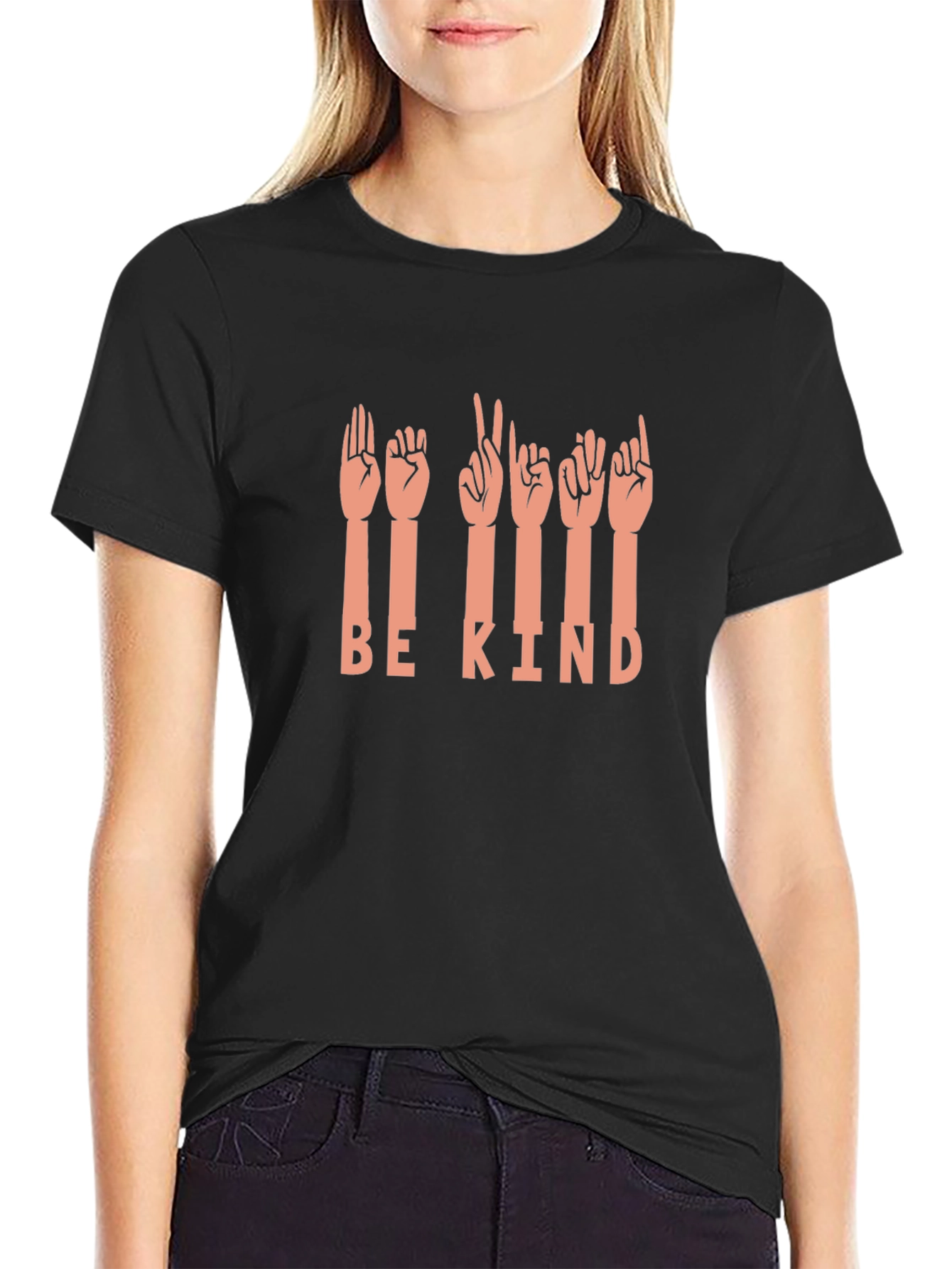 Spread positivity with this unique graphic tee! This black t-shirt features a striking design of hands in sign language spelling out the phrase "Be Kind". The design is rendered in a soft peach color that pops against the dark background. Made from a comfortable-looking fabric, this tee is perfect for casual wear. Wear it to school, social gatherings, or just around town to spread a message of kindness and inclusivity. This shirt is a great conversation starter and a reminder to be a better person. A stylish way to promote positivity and compassion.