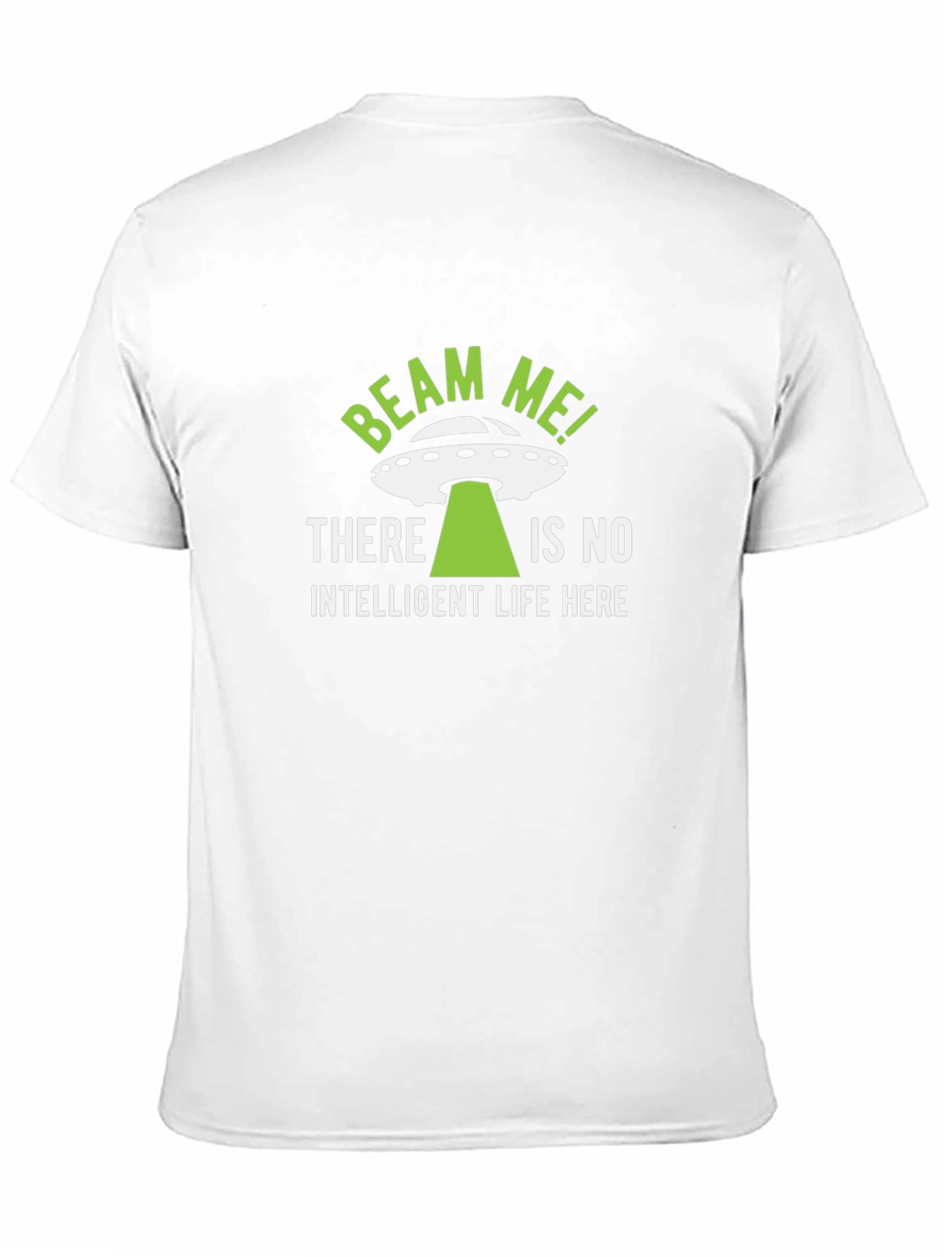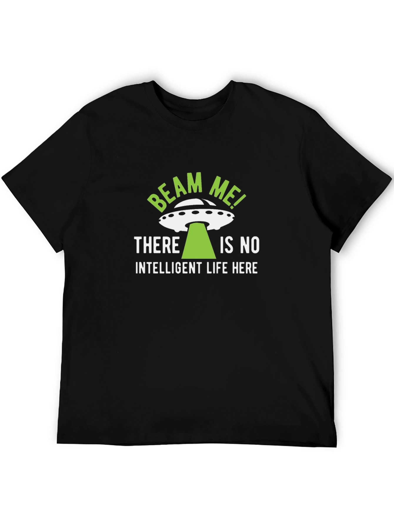 This unique black t-shirt features a humorous design with a white UFO graphic. Above the UFO, the phrase "BEAM ME!" is printed in green, and below, it says "THERE IS NO INTELLIGENT LIFE HERE" also in white. Made from a soft, breathable fabric, this tee offers a comfortable fit for everyday wear. It's a perfect conversation starter and a fun way to express your quirky side. Ideal for casual outings, sci-fi enthusiasts, or anyone with a sense of humor. Show off your unique style with this novelty tee!