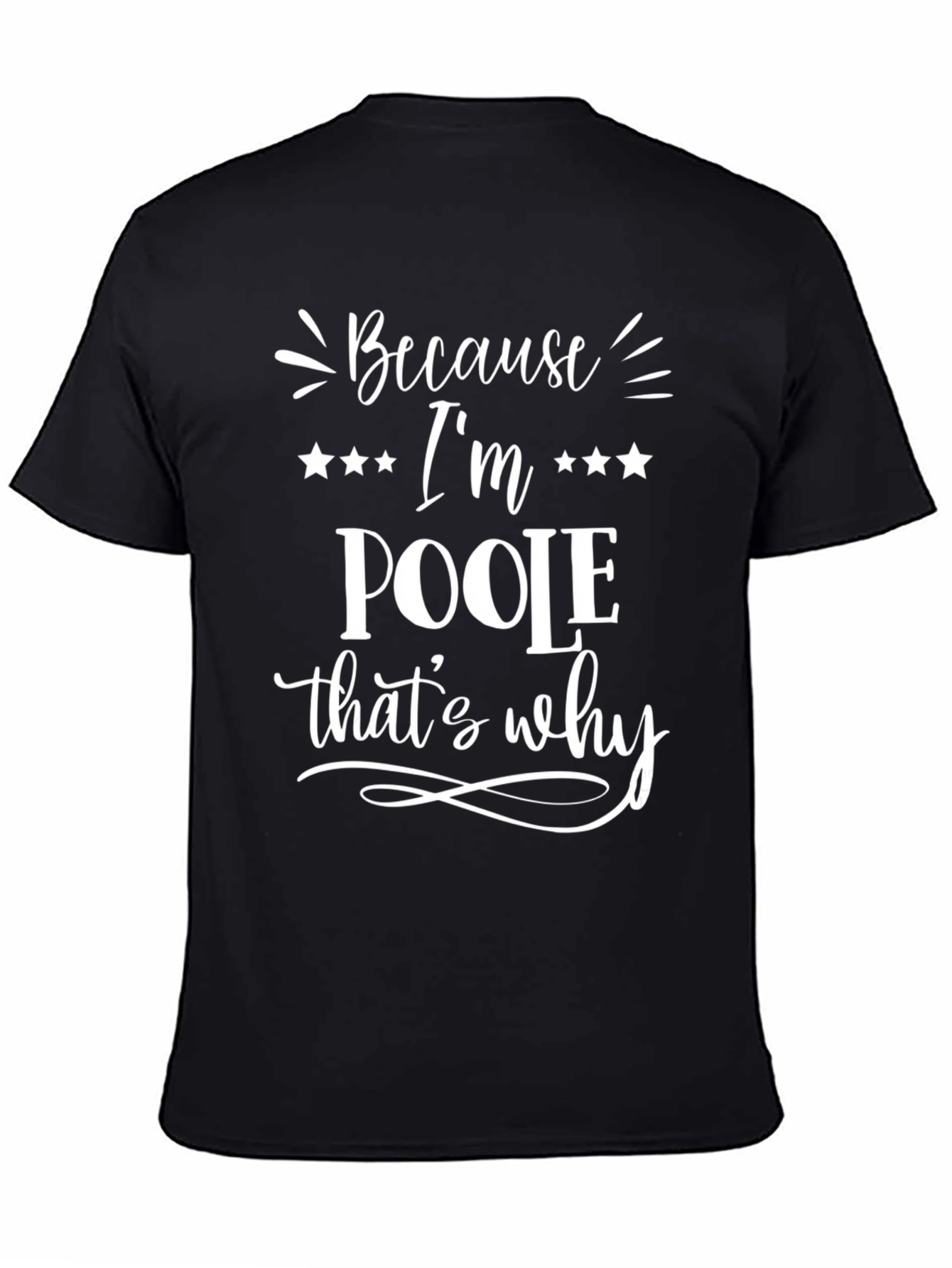 Show off your Poole pride with this stylish black t-shirt! Featuring a bold white graphic print that reads "Because I'm POOLE that's why," this shirt is perfect for casual wear. The eye-catching design includes star accents and decorative flourishes, adding a touch of flair to the classic tee. Made from comfortable and breathable fabric, this shirt ensures all-day comfort and is ideal for expressing your personality. Wear it to family gatherings, casual outings, or just lounging around the house. A must-have for anyone proud to be a Poole!