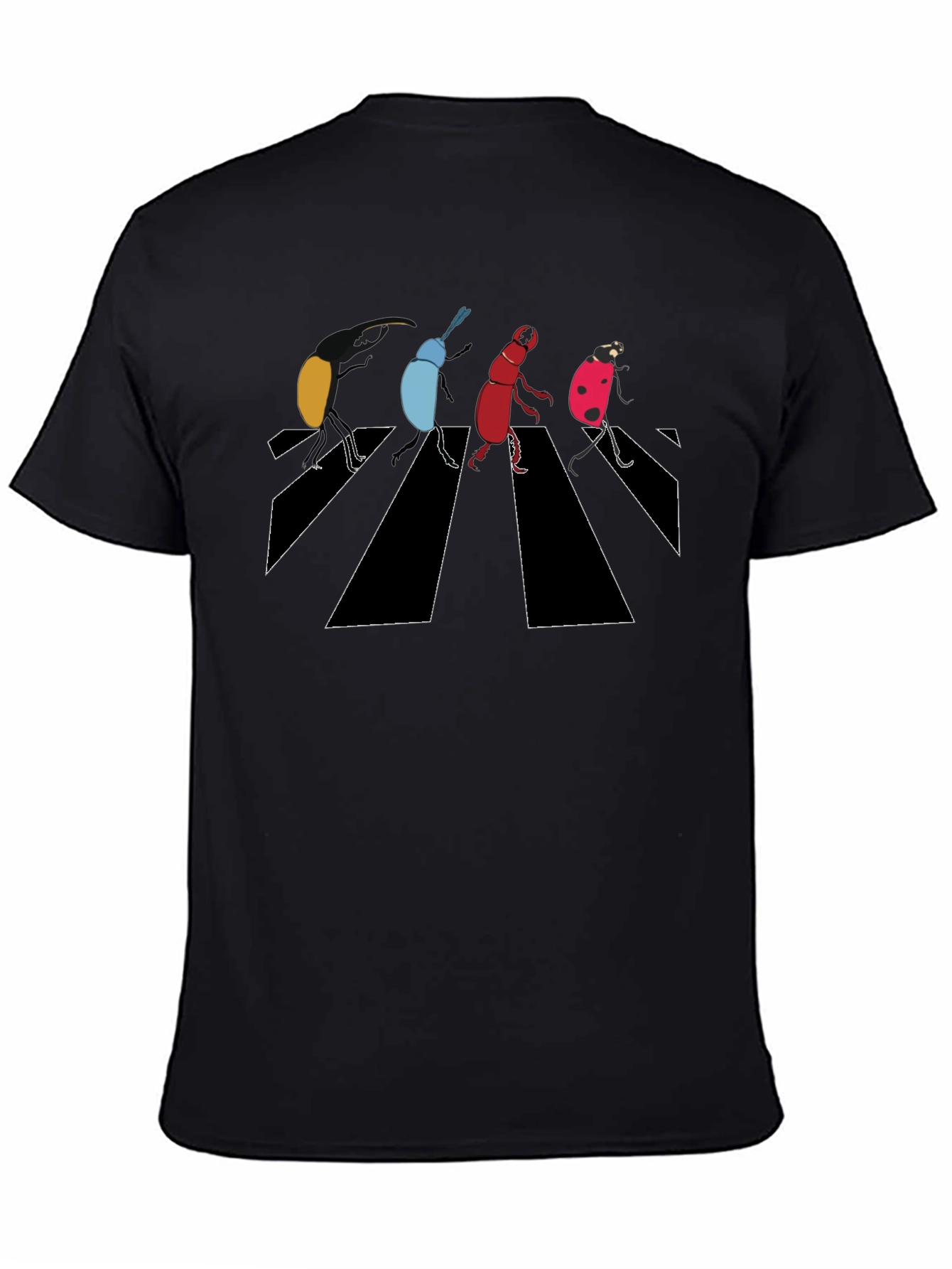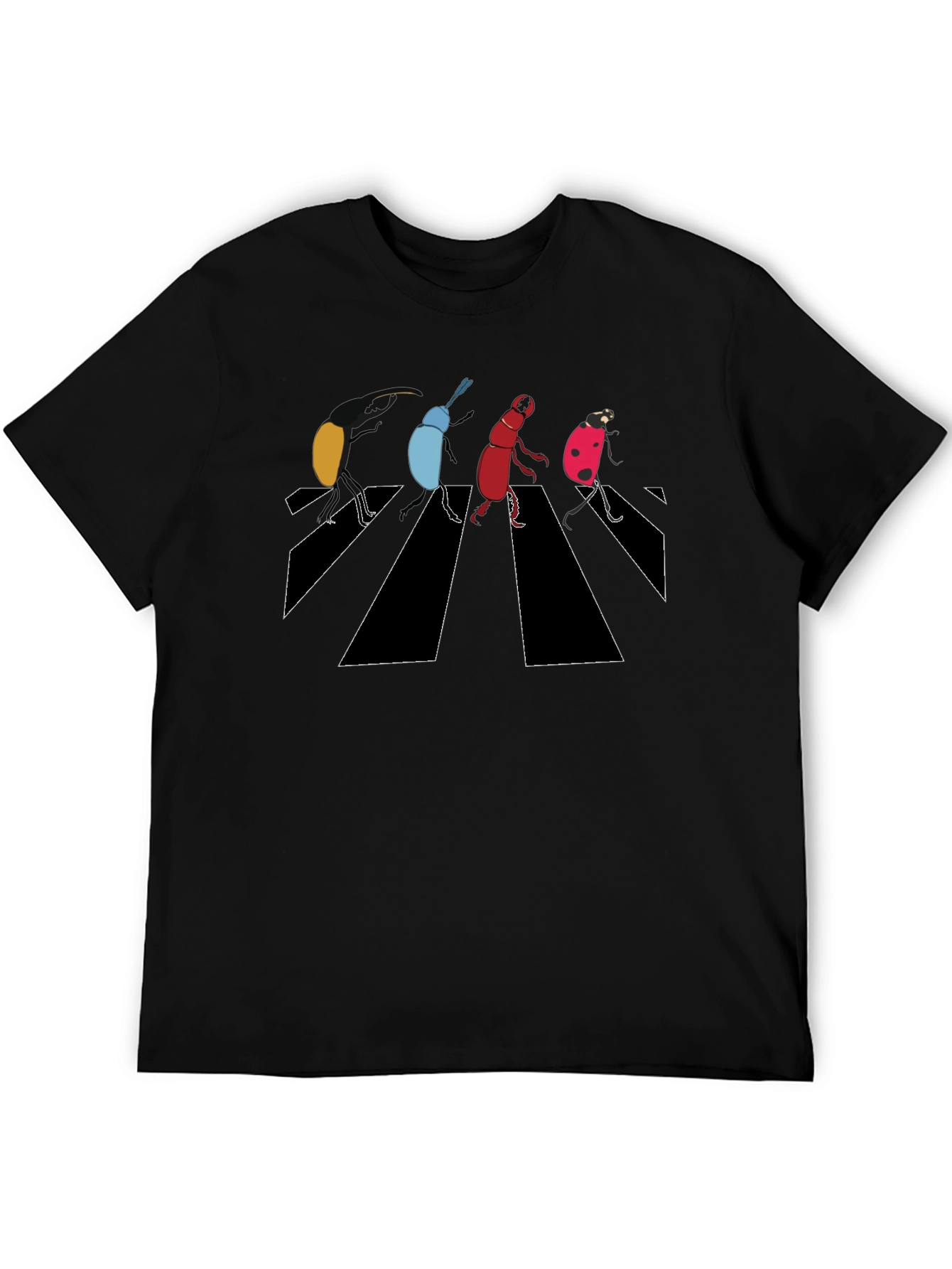 This unique black t-shirt features a creative parody design. It shows four colorful beetles crossing a street in the style of the iconic Abbey Road album cover. The design is eye-catching and sure to spark conversation. Made from what appears to be a comfortable and durable cotton blend, this tee is perfect for casual wear, music lovers, and those who appreciate quirky art. Wear it to concerts, social gatherings, or simply as a statement piece in your everyday wardrobe. Show off your unique style with this fun and fashionable t-shirt.