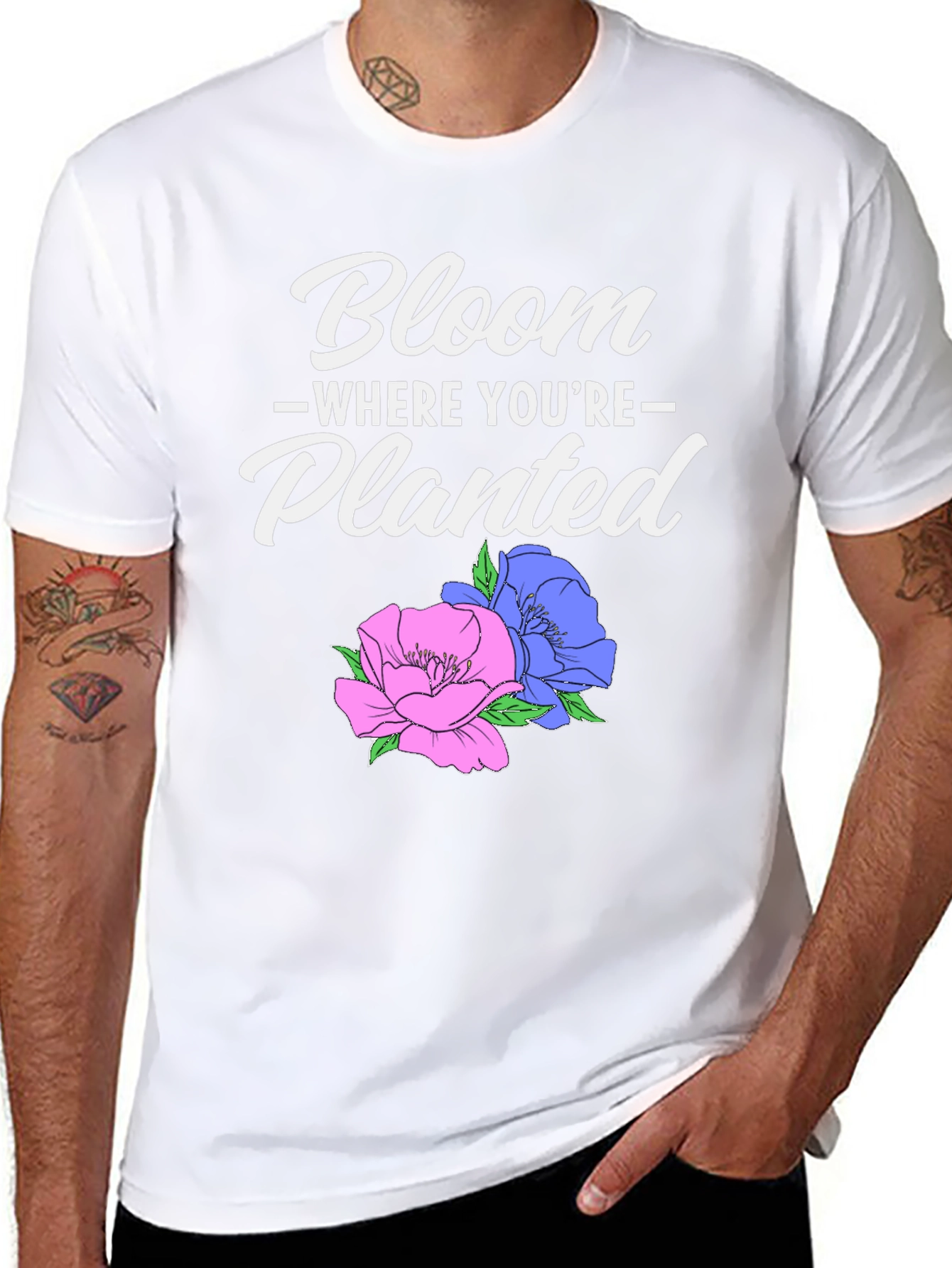 Show off your positive attitude with this stylish black T-shirt. The shirt features the phrase "Bloom Where You're Planted" in a bold, white font, accompanied by a beautiful floral graphic. The design includes vibrant pink and blue flowers, adding a pop of color. Made from comfortable and durable material, this tee is perfect for casual wear. It's an ideal way to express your optimistic outlook and spread good vibes wherever you go. Wear it to the park, coffee shop, or any casual gathering to make a statement with style.
