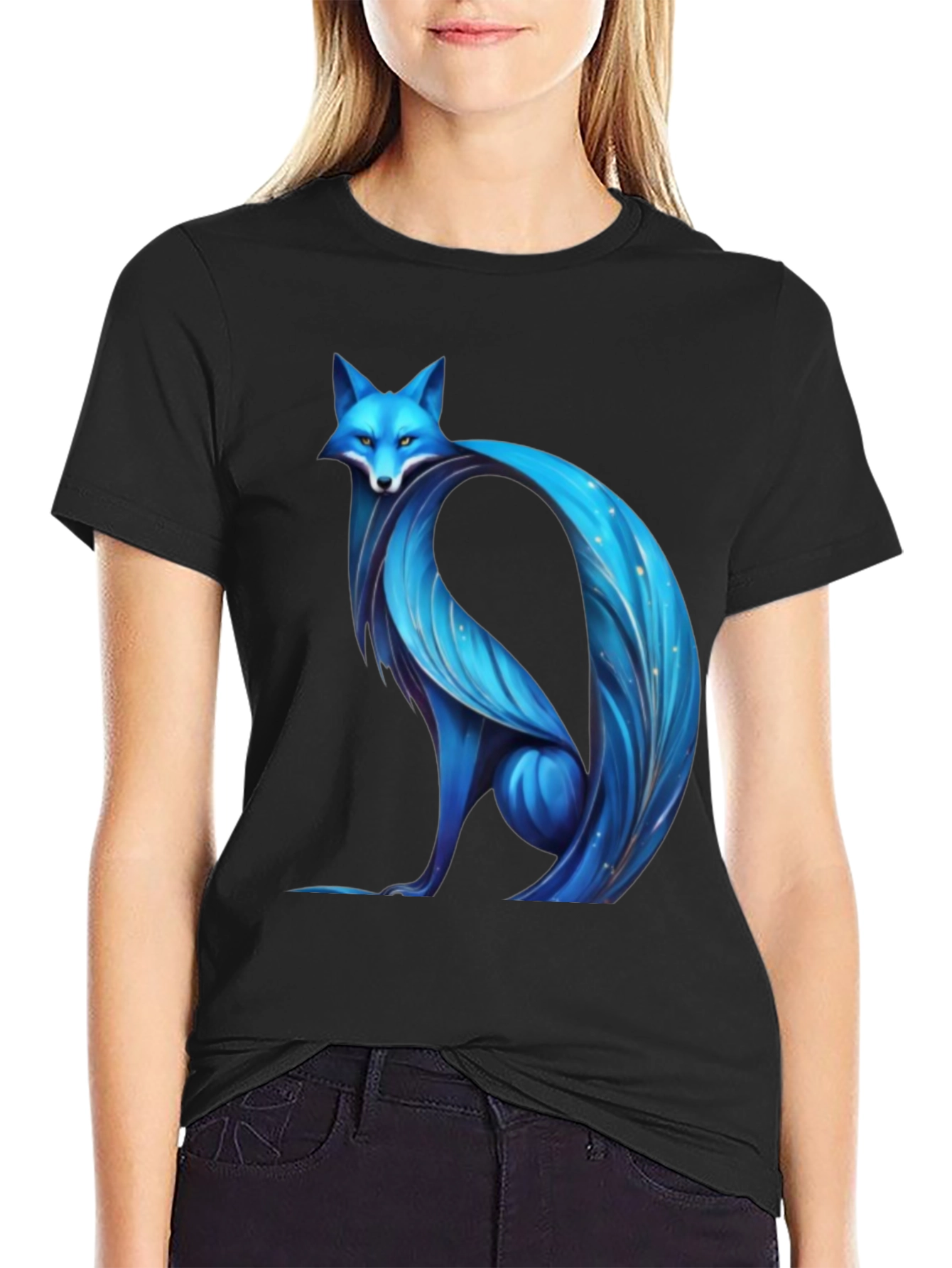 Elevate your casual style with this striking black t-shirt featuring a captivating blue fox graphic. The intricate design showcases a stylized fox with flowing lines and shimmering accents, creating a visually stunning effect. Made from a soft, comfortable fabric, this tee offers a relaxed fit perfect for everyday wear. Ideal for expressing your unique personality, this t-shirt is a great addition to any wardrobe. Pair it with jeans, shorts, or joggers for a versatile and fashionable look. Whether you're heading out with friends or relaxing at home, this blue fox tee is sure to turn heads.