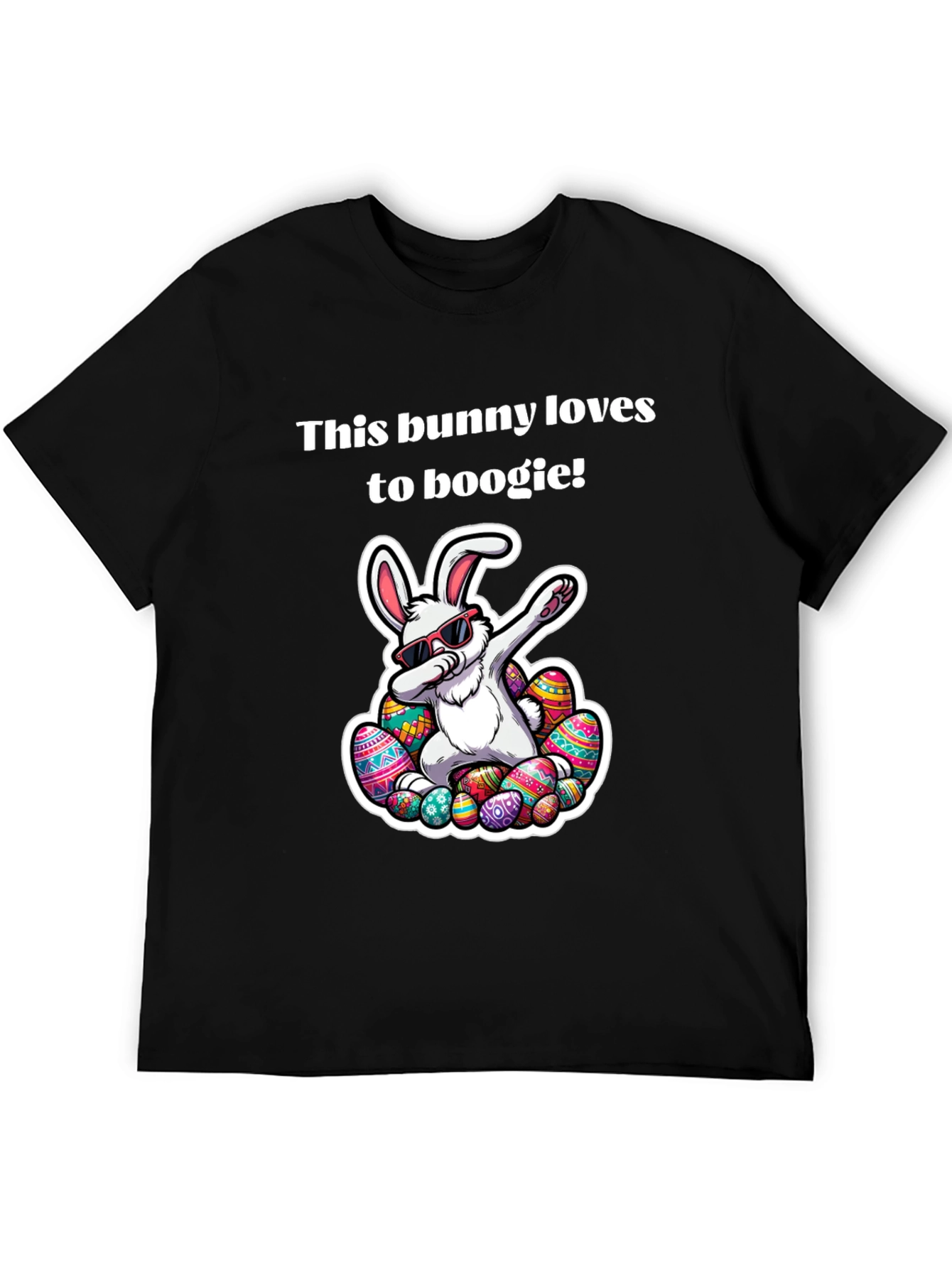 Hop into Easter with this fun black t-shirt featuring a cool bunny that loves to boogie! The design showcases a white bunny wearing sunglasses striking a fun pose and surrounded by colorful Easter eggs. This eye-catching graphic is perfect for adding a touch of playful cheer to your holiday attire. Made from comfortable materials, this tee offers a relaxed fit that's ideal for Easter egg hunts, family gatherings, or casual everyday wear. Show off your festive spirit and get ready to celebrate Easter in style with this unique bunny tee!