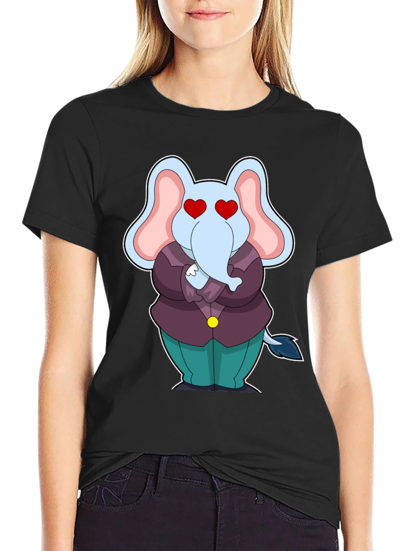 Show off your love for whimsical designs with this unique t-shirt featuring an adorable cartoon elephant. The elephant is illustrated with charming detail, with heart-shaped eyes, a smart jacket, and a confident pose. The design is printed on a black, casual fit tee, perfect for everyday wear. Made from soft, breathable fabric, this shirt offers both comfort and style. It’s an ideal conversation starter and a fun addition to any wardrobe. Great for casual outings, themed events, or just expressing your fun-loving personality.