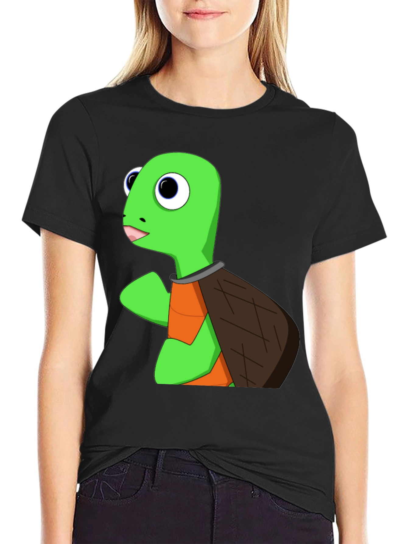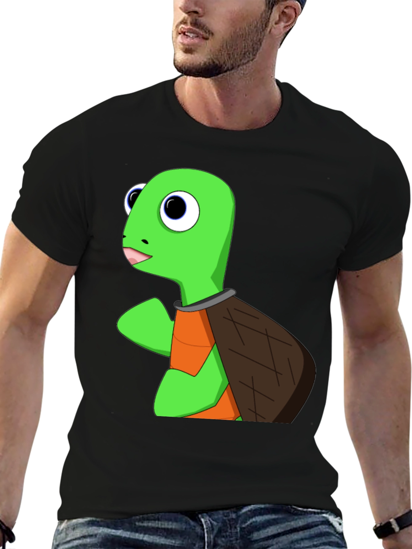 Show off your fun side with this unique black t-shirt featuring a colorful cartoon turtle graphic. The design showcases a bright green turtle with an orange undershirt and brown shell, rendered in a playful, eye-catching style. Made from a comfortable-looking fabric, this tee is perfect for casual wear, whether you're lounging at home, hanging out with friends, or making a statement wherever you go. The bold graphic is sure to spark conversations and bring a smile to anyone's face. Add a touch of whimsy to your wardrobe with this fun and quirky t-shirt!