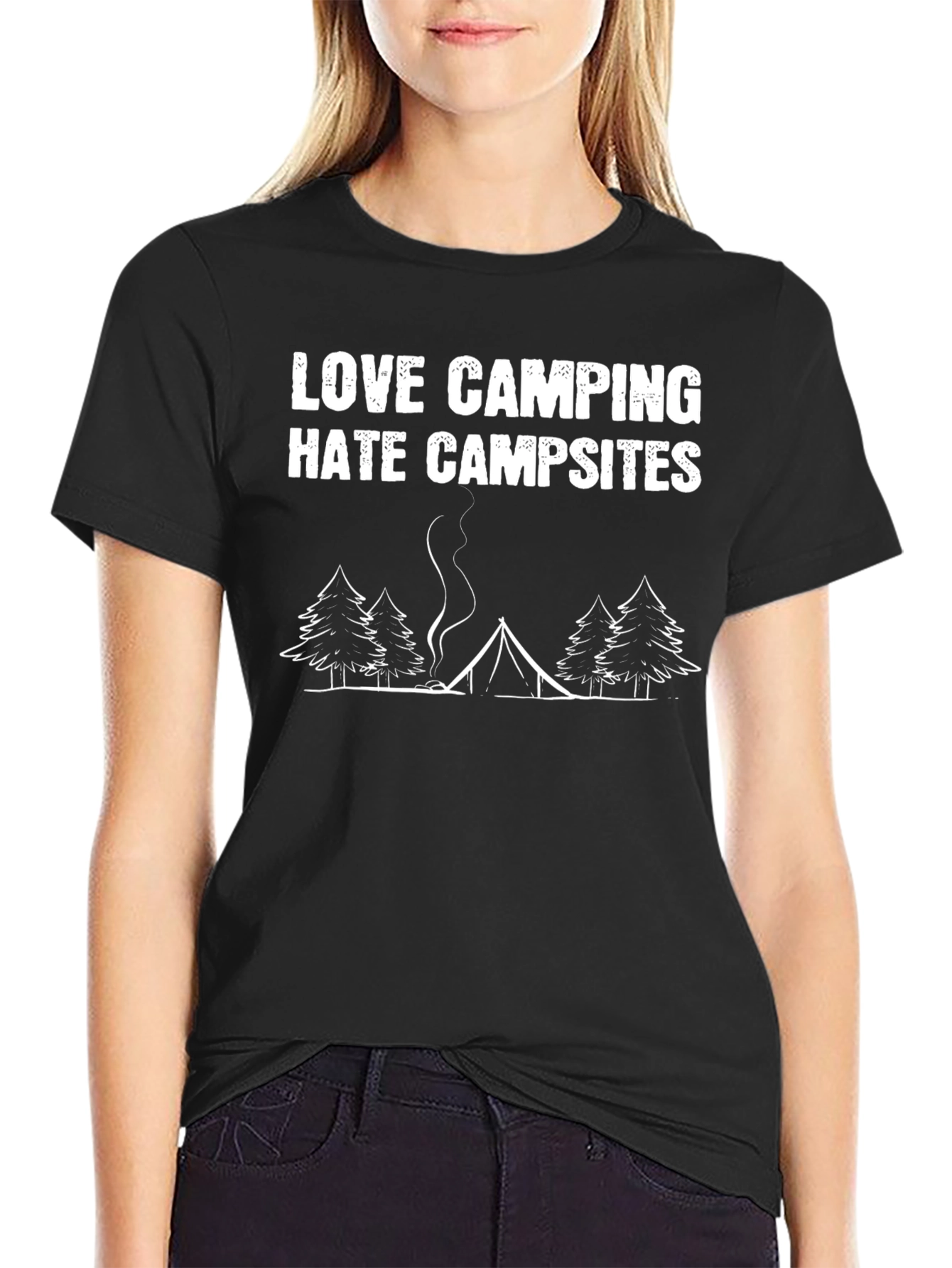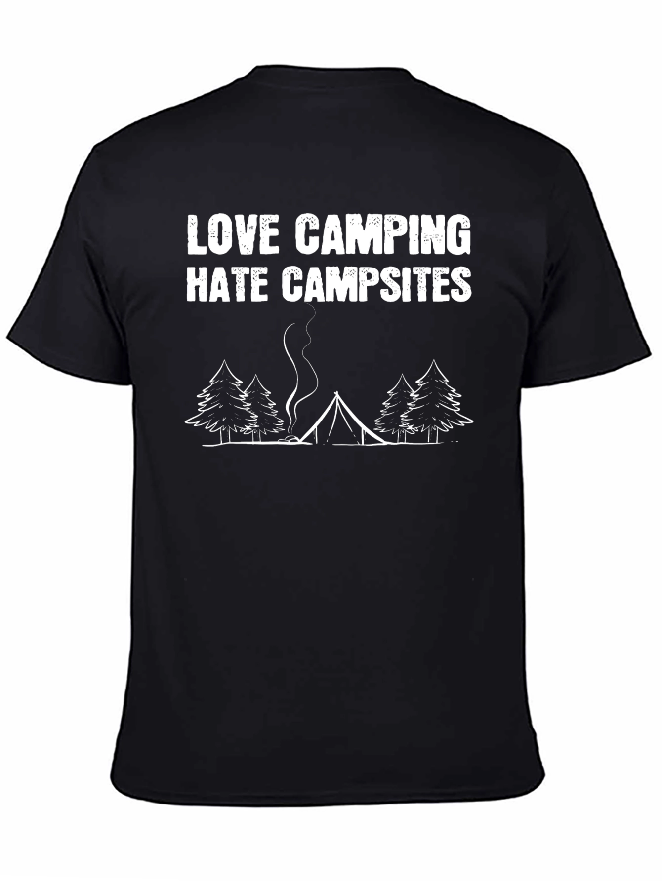 Show off your love for the great outdoors with this unique graphic tee! This black t-shirt features a bold white print that reads "LOVE CAMPING HATE CAMPSITES" above a simple, stylized illustration of a tent nestled between trees, with a wisp of smoke rising from a campfire. The design is perfect for campers and outdoor enthusiasts who appreciate a touch of humor. Made from a comfortable material, this tee is ideal for casual wear, camping trips, or just expressing your love for nature.