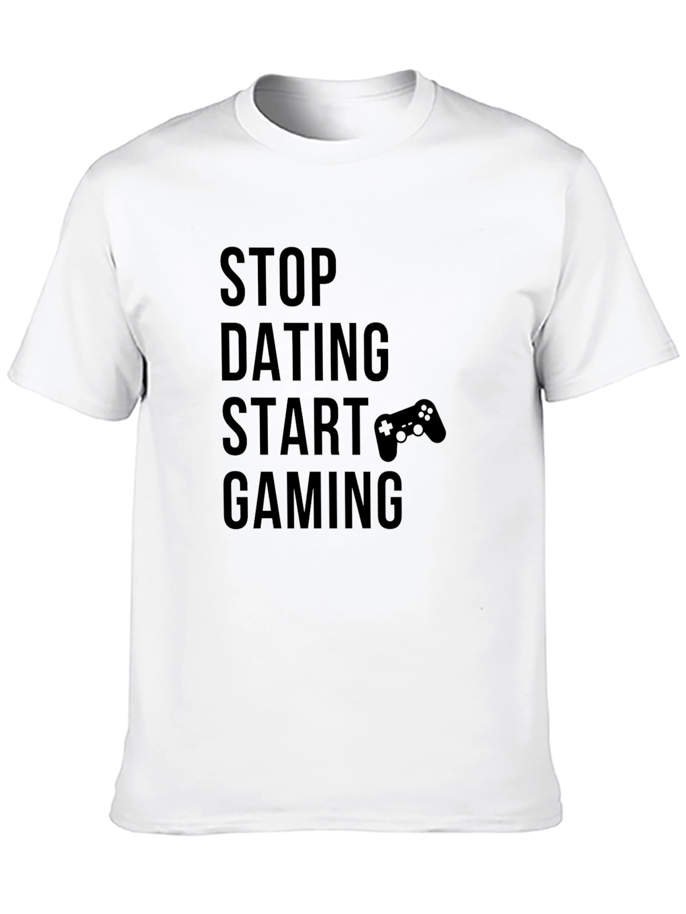 This classic black t-shirt features a playful message for gamers: "Stop Dating Start Gaming," complete with a controller graphic. Made from a soft, comfortable fabric, this shirt is perfect for casual wear and gaming sessions. The bold text and simple design make it a statement piece for any gaming enthusiast. Show off your passion for gaming and make a statement with this fun and relatable t-shirt. Perfect for wearing at home, gaming events, or hanging out with friends, this tee is sure to spark conversations and show your dedication to the game.