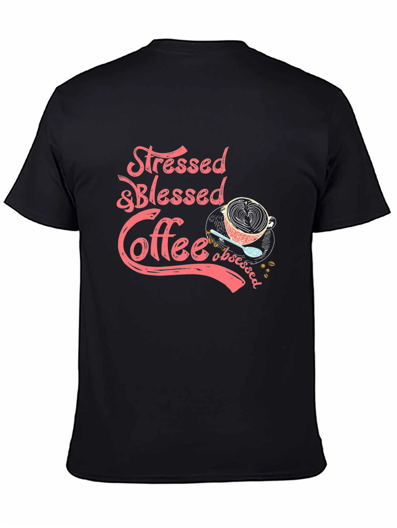 Embrace your love for coffee with this stylish black graphic tee! The design features the words "Stressed & Blessed Coffee Obsessed" in a playful coral font, accompanied by a charming illustration of a coffee cup with a latte art heart, a spoon, and scattered coffee beans. Made from a comfortable-looking material, this t-shirt is perfect for casual outings, coffee dates, or simply relaxing at home. Show off your coffee addiction with this unique and eye-catching top! It's ideal for those who appreciate a good cup of coffee and want to express their personality through fashion. Get yours today!