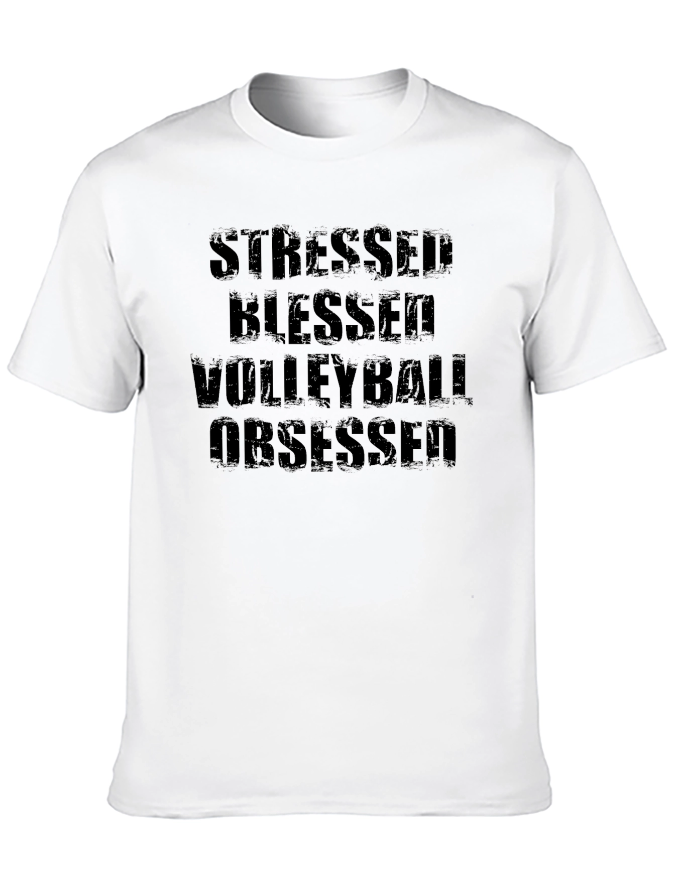 Show off your passion for volleyball with this stylish black t-shirt. The shirt features bold, distressed text that reads "Stressed, Blessed, Volleyball Obsessed," perfect for expressing your dedication to the sport. Made from comfortable, breathable fabric, this tee is ideal for wearing to games, practices, or casual outings. The classic black color makes it easy to pair with any outfit, while the eye-catching design is sure to turn heads and spark conversations. Whether you're a player, coach, or volleyball enthusiast, this shirt is a must-have addition to your wardrobe. Get yours today and let the world know where your heart lies—on the volleyball court!
