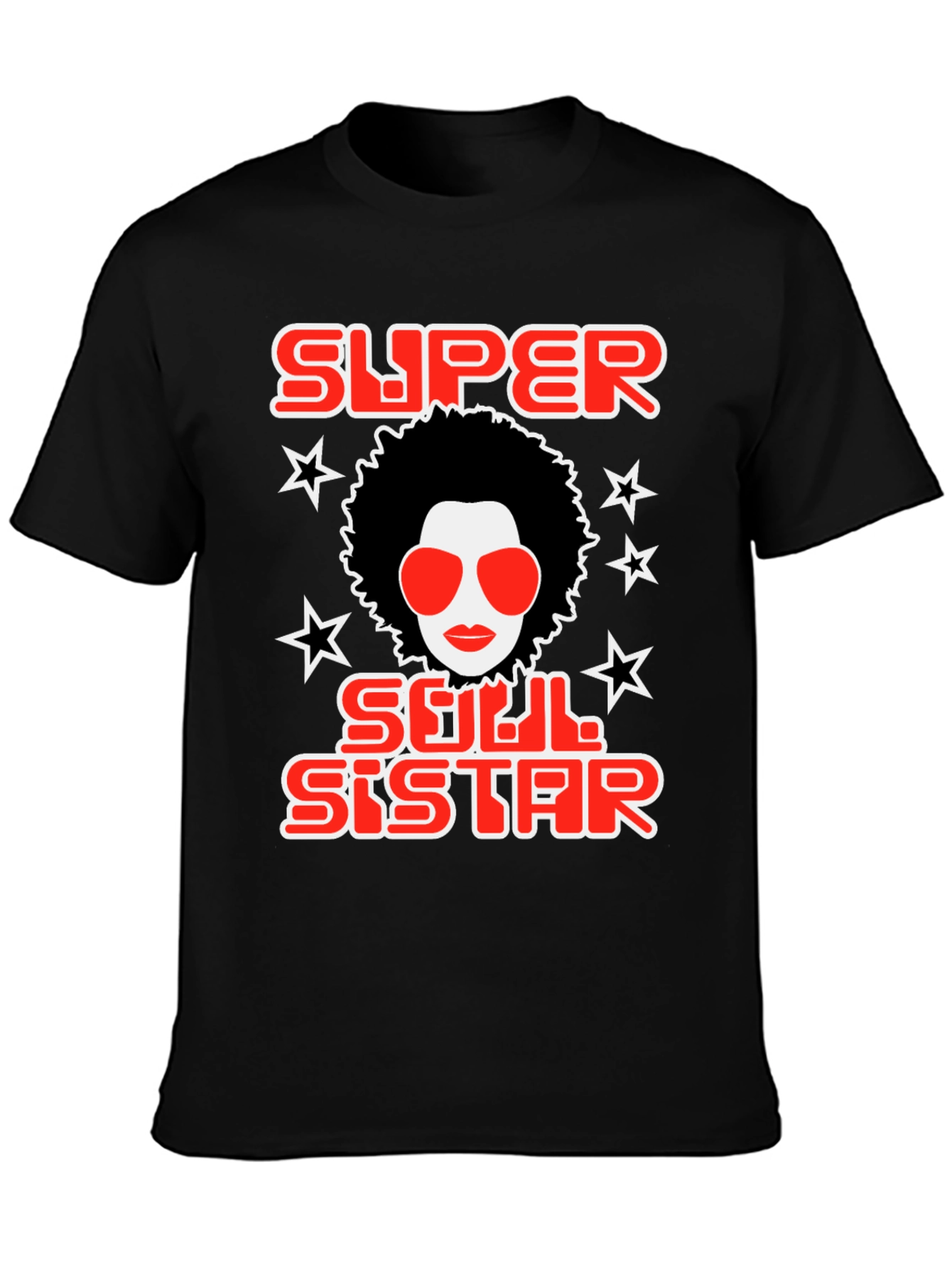Show off your soulful style with this eye-catching graphic t-shirt! Featuring the phrase "Super Soul Sister" in a bold red and white font, this shirt makes a statement. A central image of a woman with an afro and large red sunglasses adds a touch of retro flair, surrounded by star accents for a fun and playful vibe. Made from a comfortable, breathable fabric, this black t-shirt is perfect for casual wear. Whether you're heading to a concert, hanging out with friends, or simply want to express your unique personality, this tee is a great choice. Pair it with your favorite jeans or shorts for a stylish and effortless look.