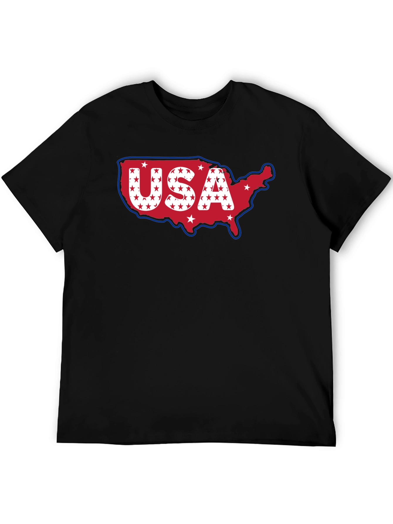 Show your American pride with this stylish black t-shirt! This shirt features a unique USA map design, filled with stars and the letters "USA" in white. The map is outlined in red and blue, adding a patriotic touch. Made from a soft, comfortable fabric, this tee is perfect for casual wear, 4th of July celebrations, or any day you want to show your love for the United States. The classic fit makes it a versatile addition to any wardrobe. A perfect way to express your patriotism and look great doing it!