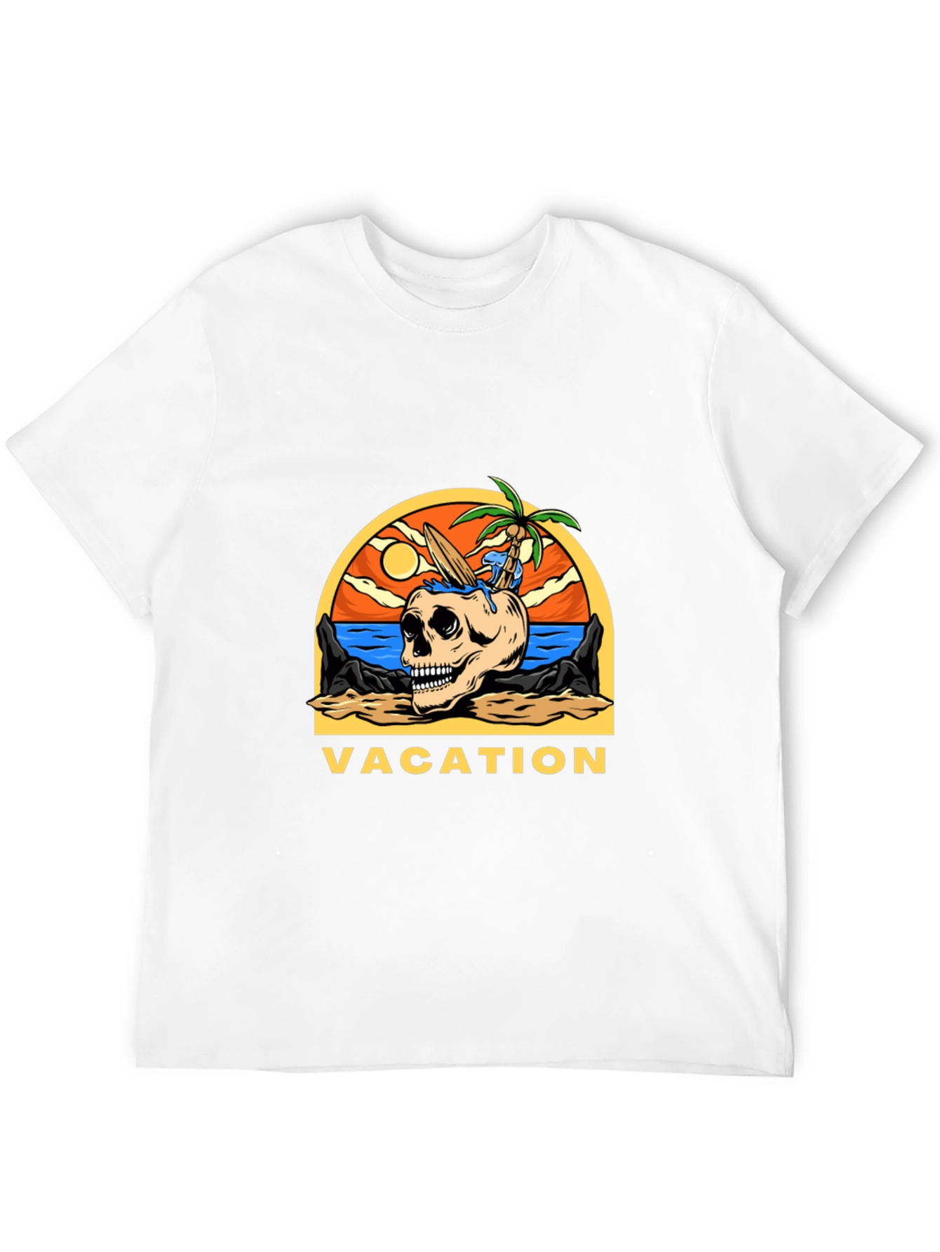 Embrace the laid-back vibes with this unique Vacation Skull Graphic T-Shirt. The shirt features a skull on a beach scene with a palm tree coming out of the top with the text 'Vacation' below it. Perfect for those who love the beach, surfing, or just a relaxed, tropical style. Made from comfortable fabric, this tee is ideal for casual wear, vacation outings, or simply expressing your unique personality. The vibrant colors and eye-catching design will make you stand out from the crowd. Available in a classic fit, this t-shirt is a must-have addition to any wardrobe. Get yours today and bring the beach with you wherever you go!