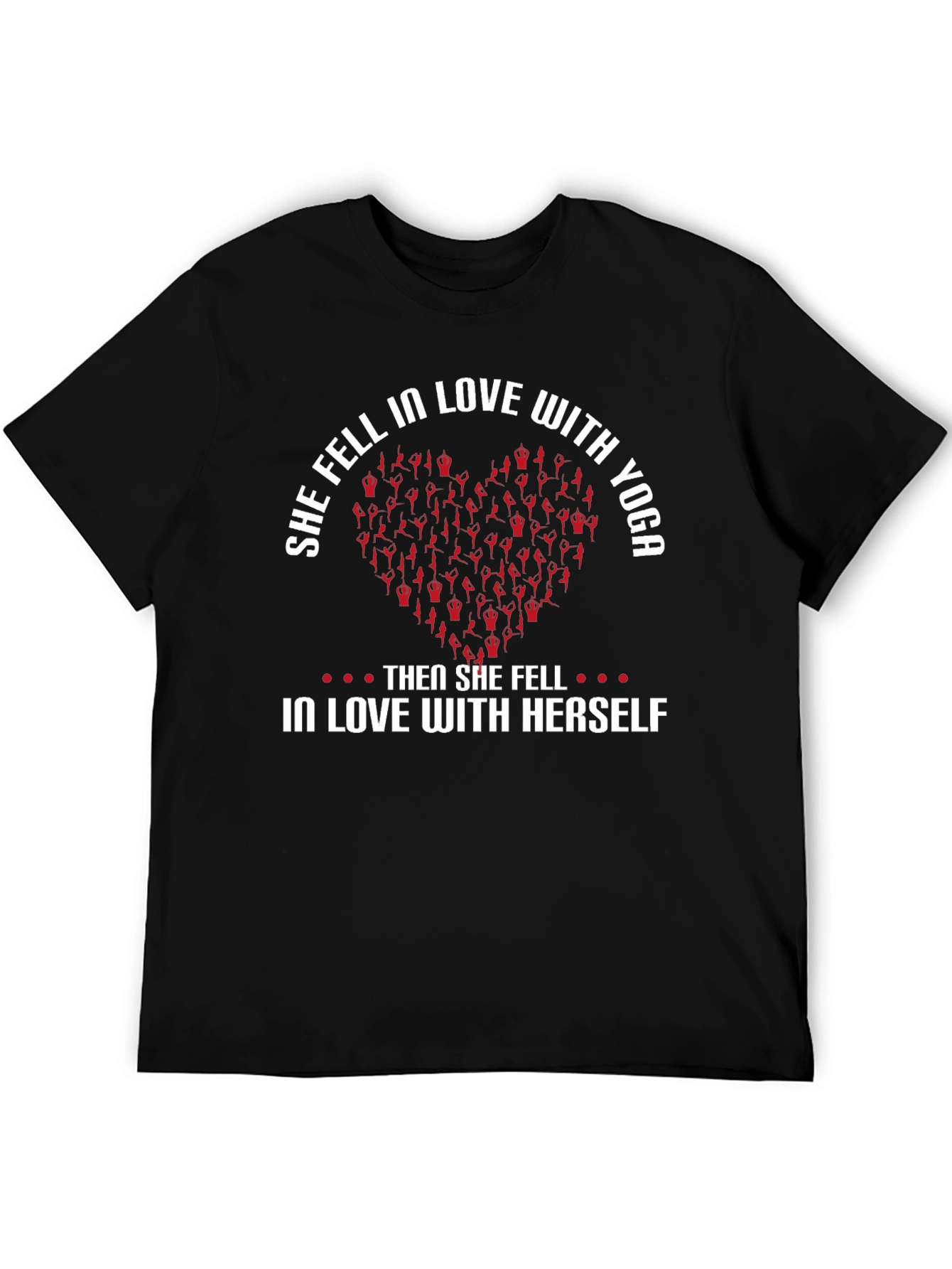 Show your love for yoga and self-acceptance with this stylish black t-shirt. Featuring a heart-shaped design made of yoga poses, surrounded by the empowering message "She Fell in Love with Yoga... Then She Fell in Love with Herself", this tee is perfect for yoga enthusiasts and anyone embracing self-love. The design is printed in red and white, offering a striking contrast against the shirt's black background. Made from a comfortable, breathable fabric, this tee is ideal for everyday wear, yoga classes, or casual outings. Wear your passion and inspire others with this unique and meaningful t-shirt.